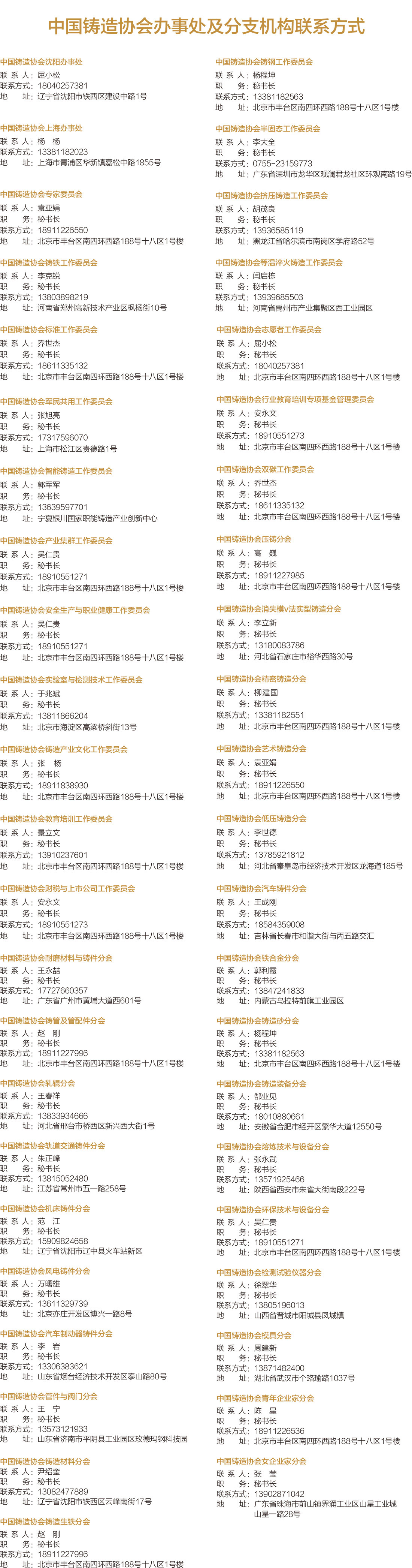 中国铸造协会秘书处各部联系方式