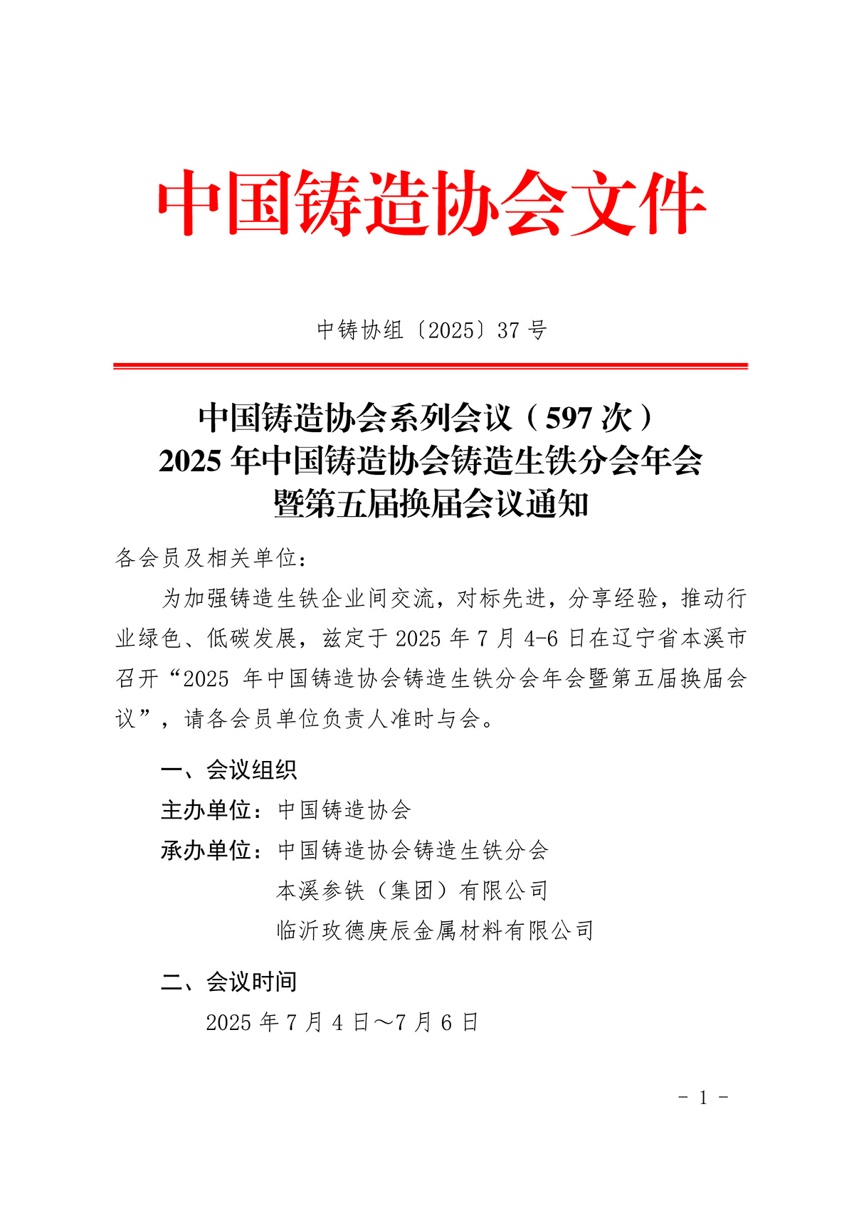 2025年中国铸造协会铸造生铁分会年会暨第五届换届会议通知
