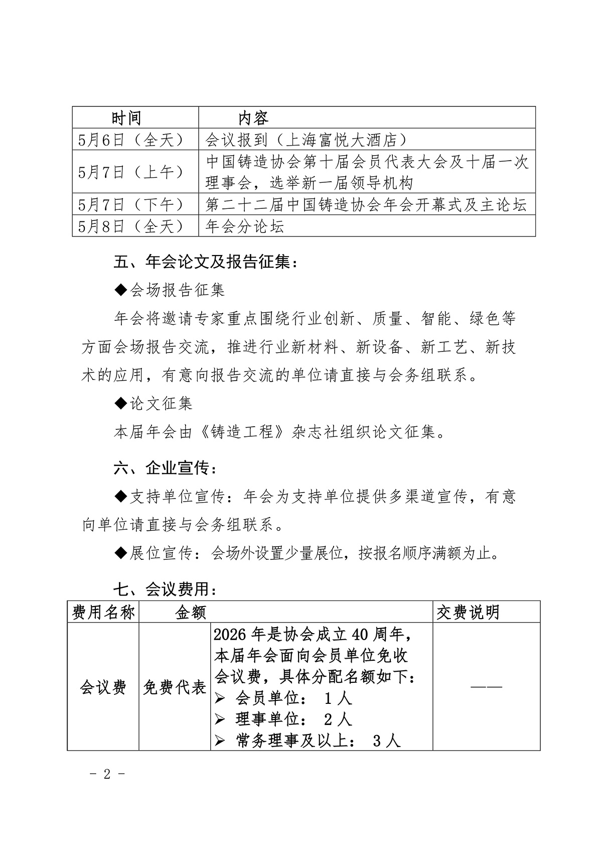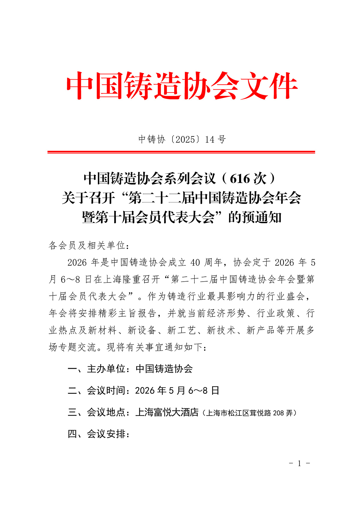 关于召开“第二十二届中国铸造协会年会暨第十届会员代表大会”的预通知