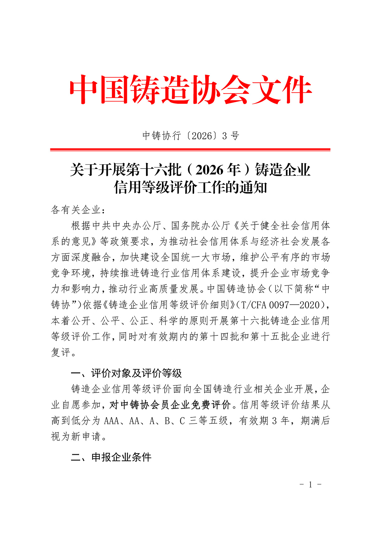 关于开展第十六批(2026年)铸造企业信用等级评价工作的通知