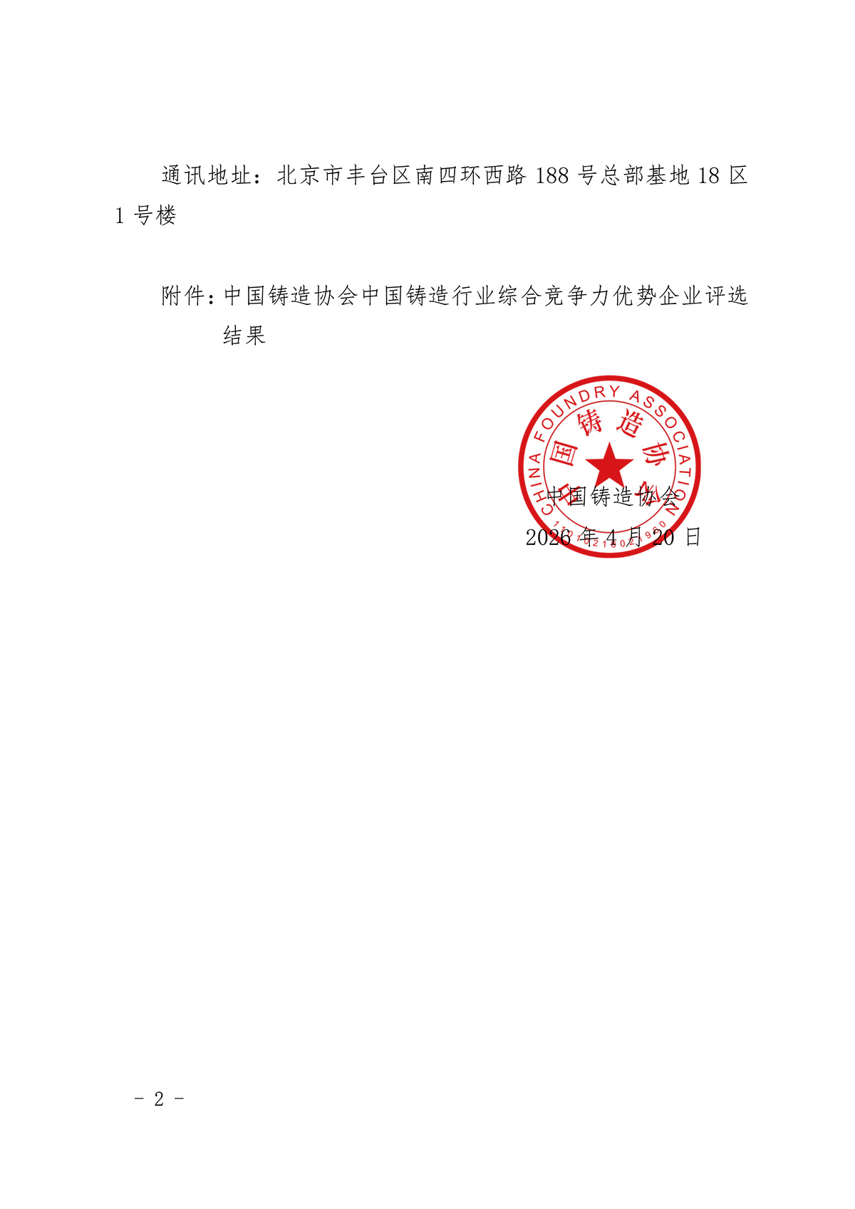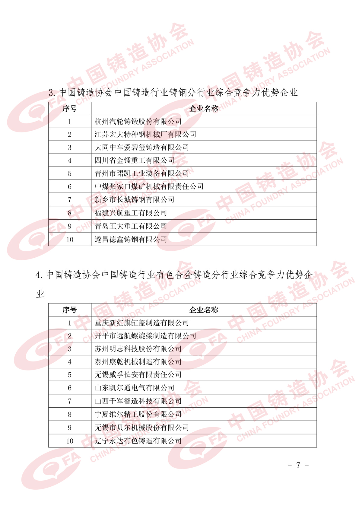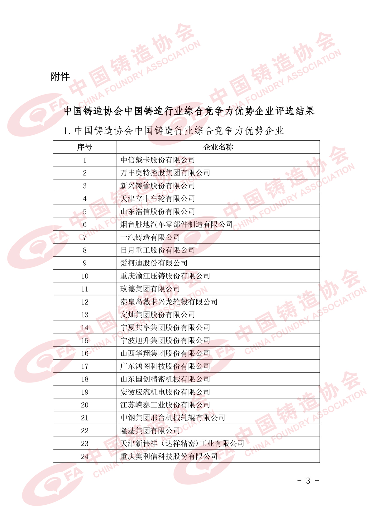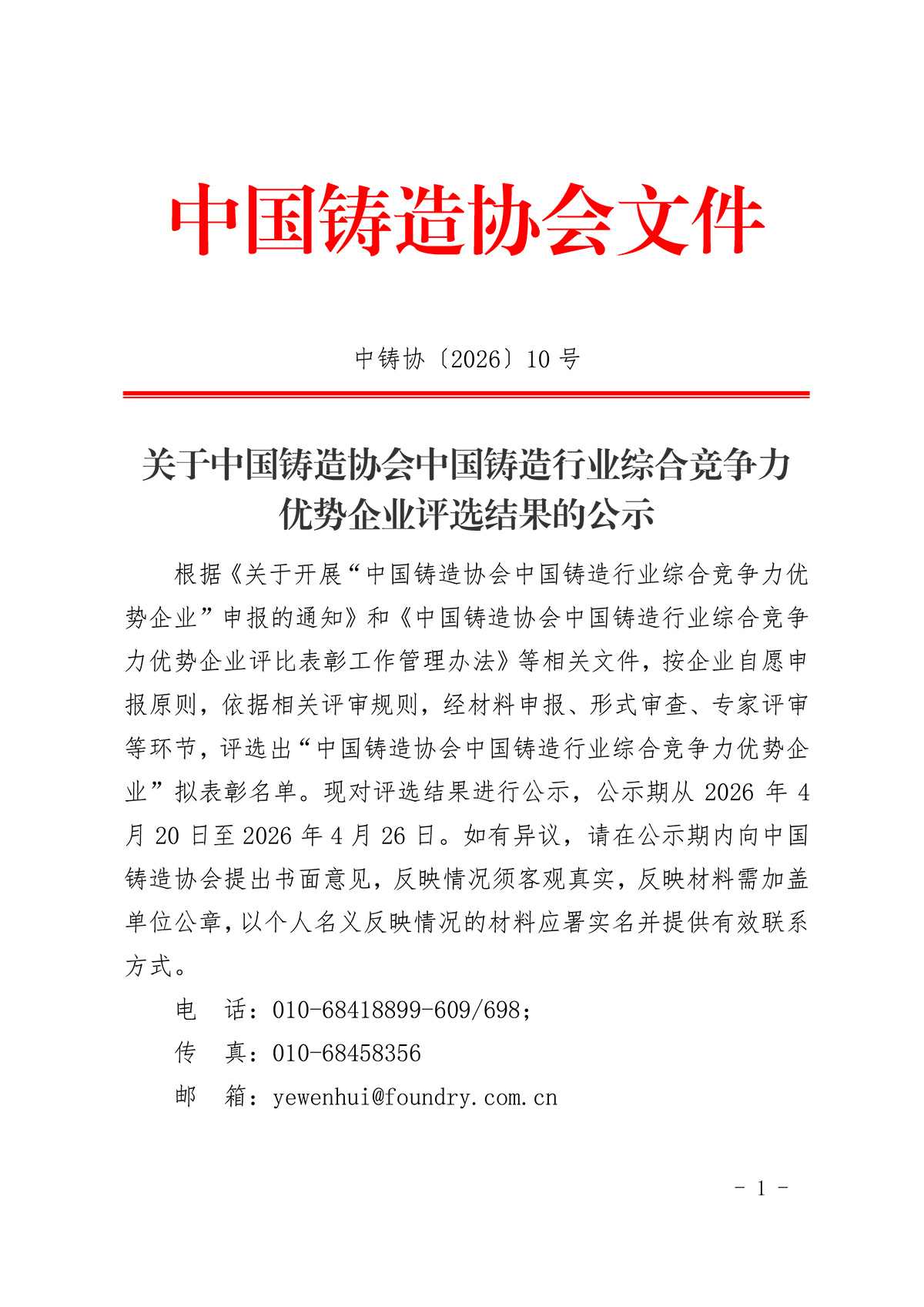 关于中国铸造协会中国铸造行业综合竞争力优势企业评选结果的公示