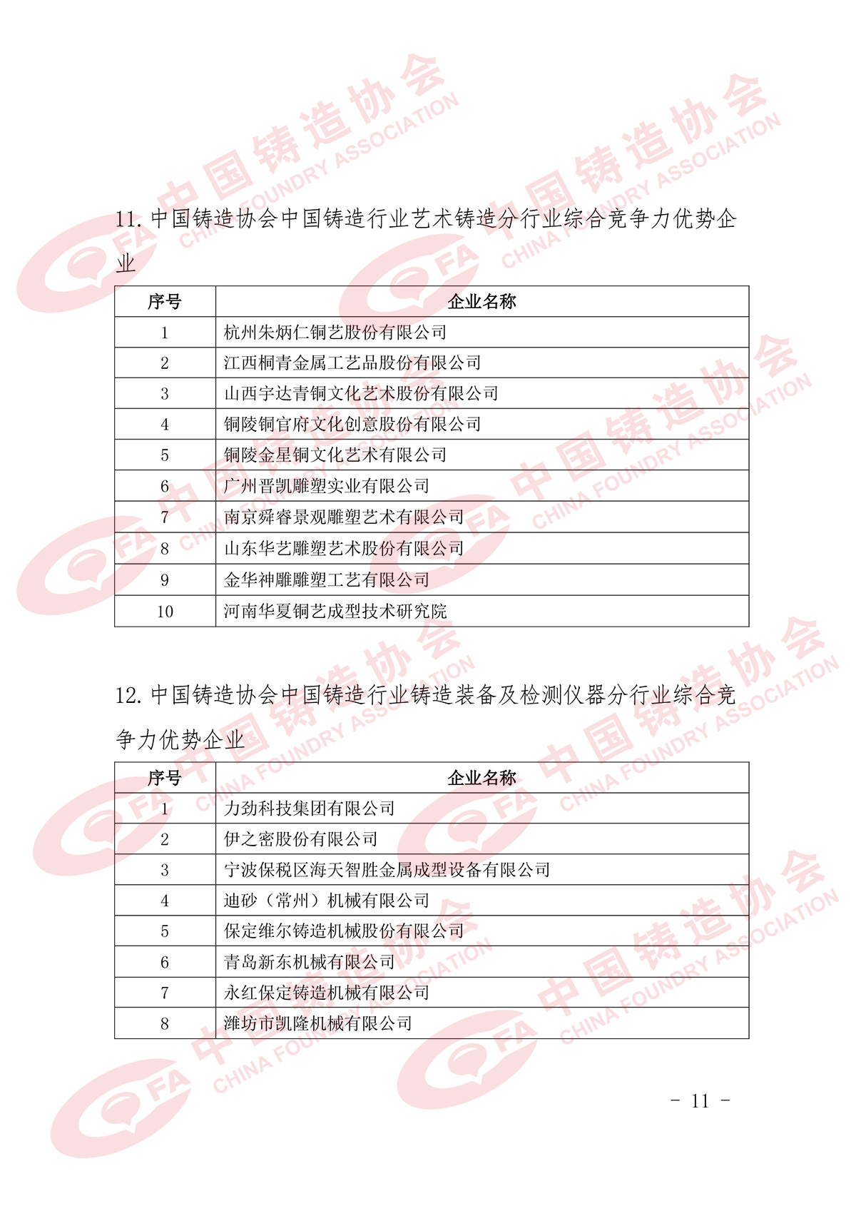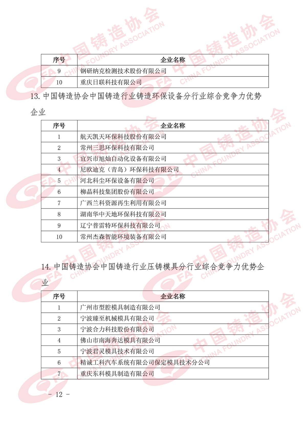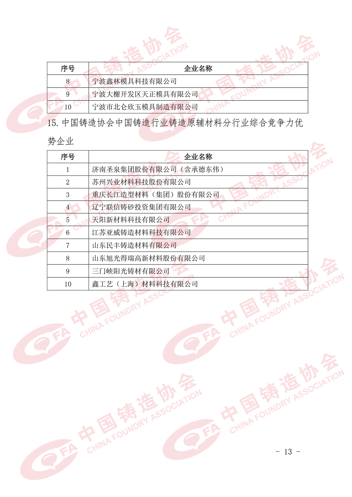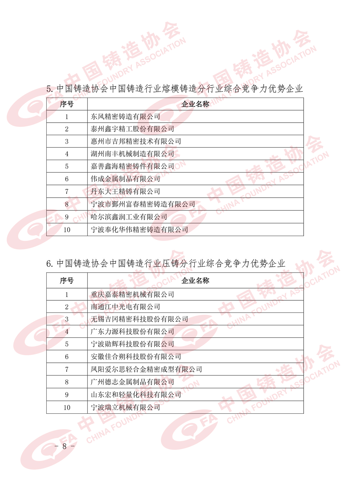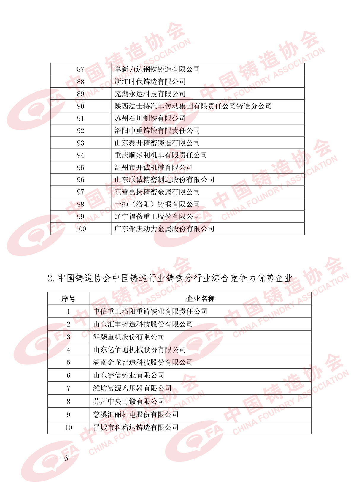 关于中国铸造协会中国铸造行业综合竞争力优势企业评选结果的公示