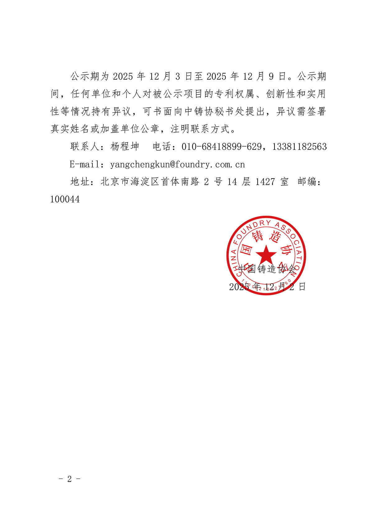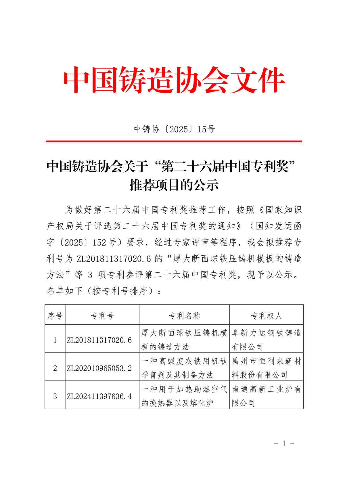 中国铸造协会关于“第二十六届中国专利奖”推荐项目的公示