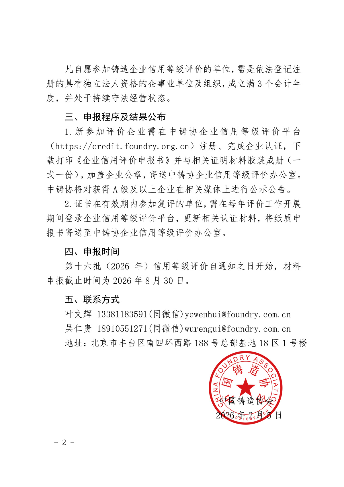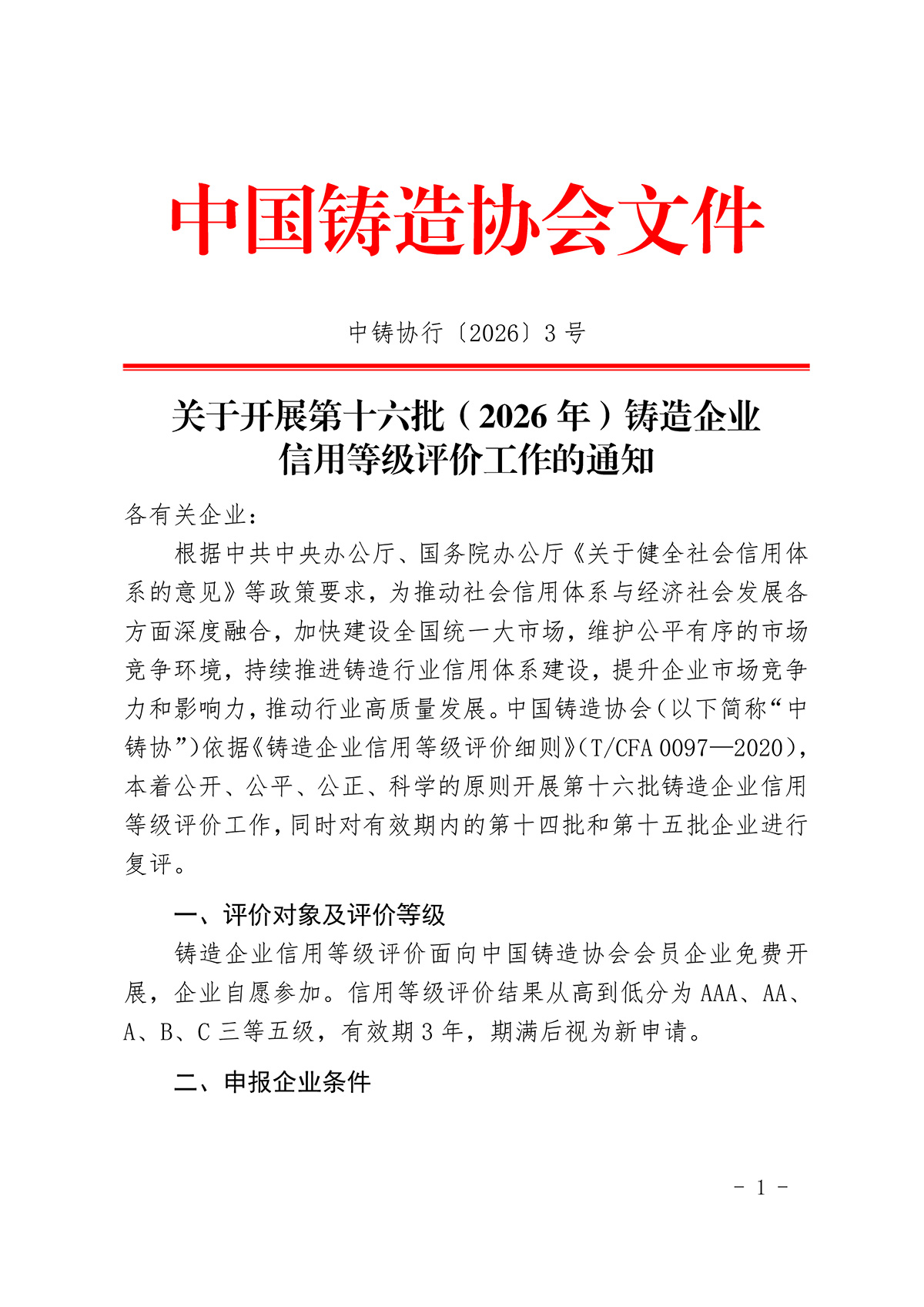 关于开展第十六批(2026年)铸造企业信用等级评价工作的通知